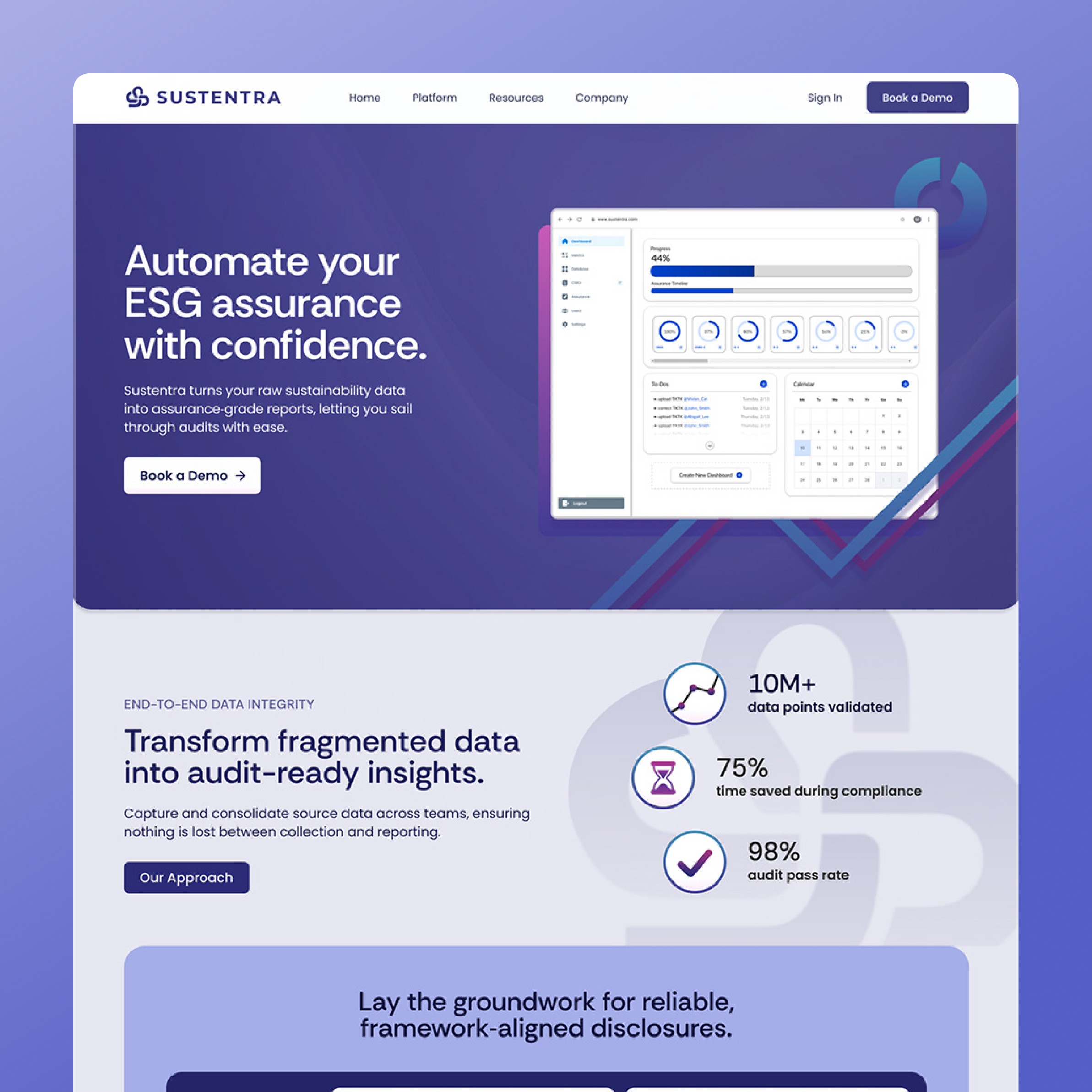 I joined Sustentra midway through discovery to build a clickable demo from early features, develop a brand identity, and design their marketing site — all on a tight timeline.